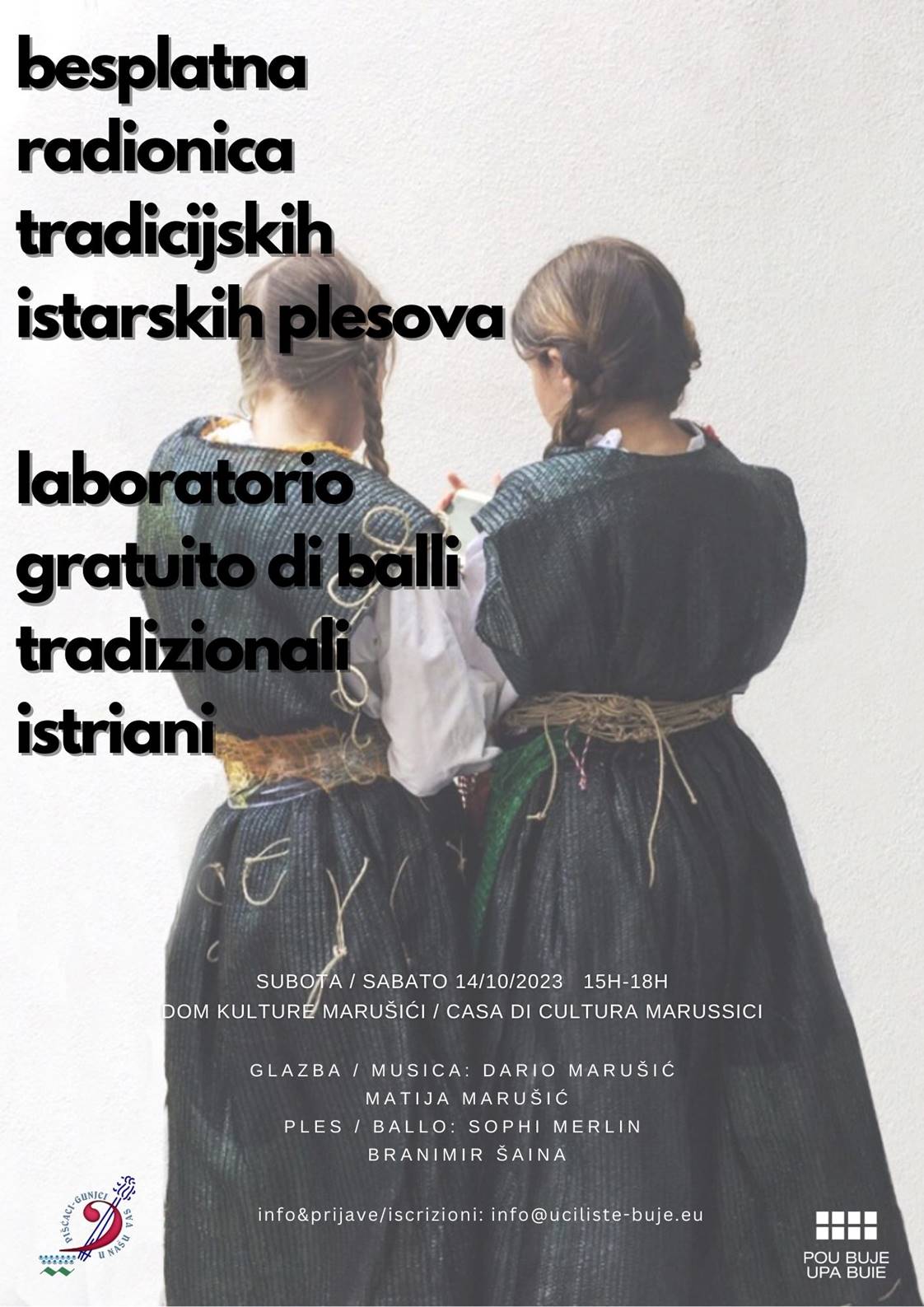 Pozivamo vas na besplatnu radionicu tradicijskih istarskih plesova koja će se održati u Domu kulture Marušići. Radionica će se održati u subotu, 14. listopada, s početkom u 15 sati.