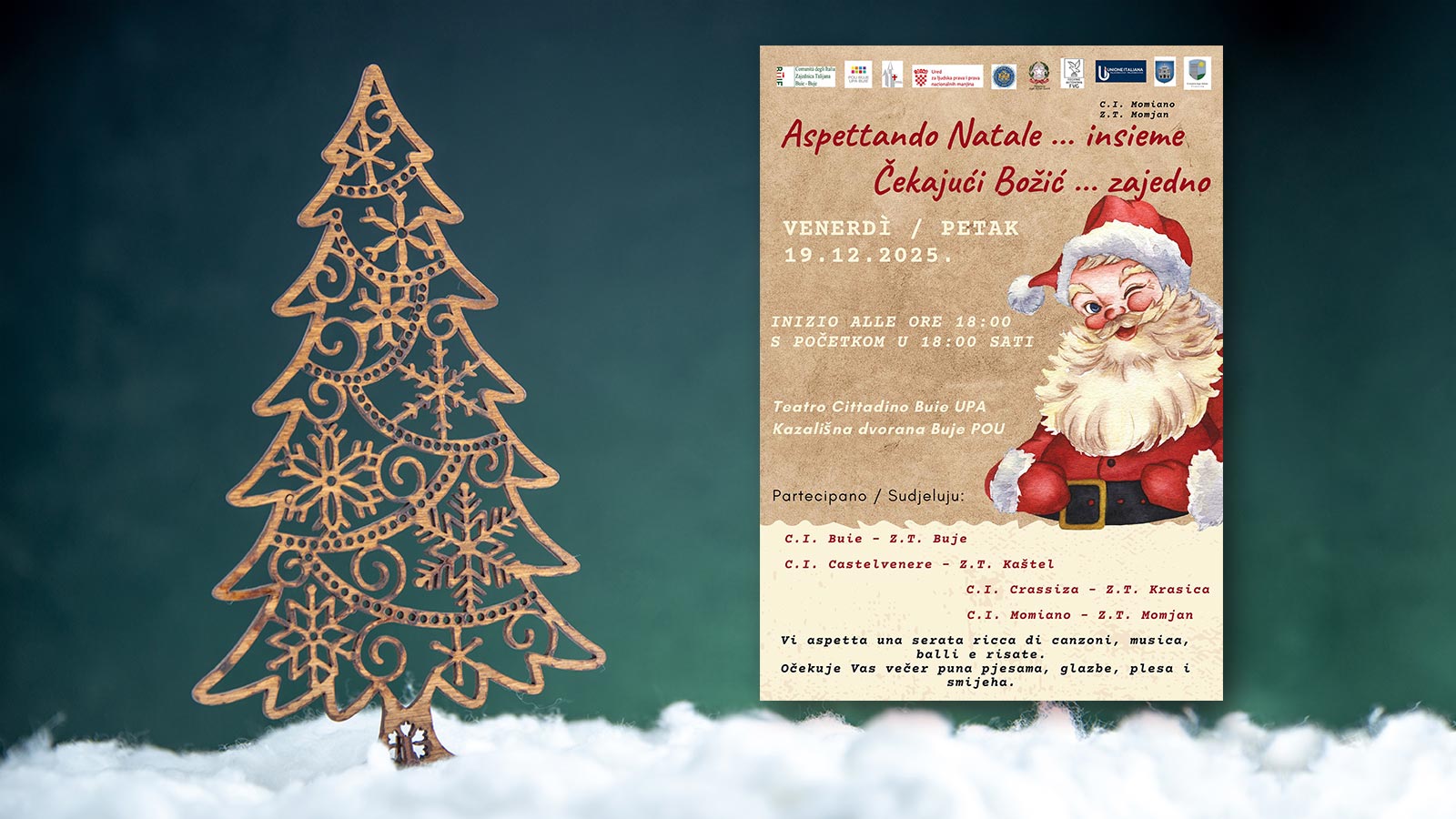 U petak 19. prosinca 2025. s početkom u 18:00 sati u kazališnoj dvorani POU Buje održava se blagdanski program Aspettando Natale insieme Čekajući Božić zajedno.