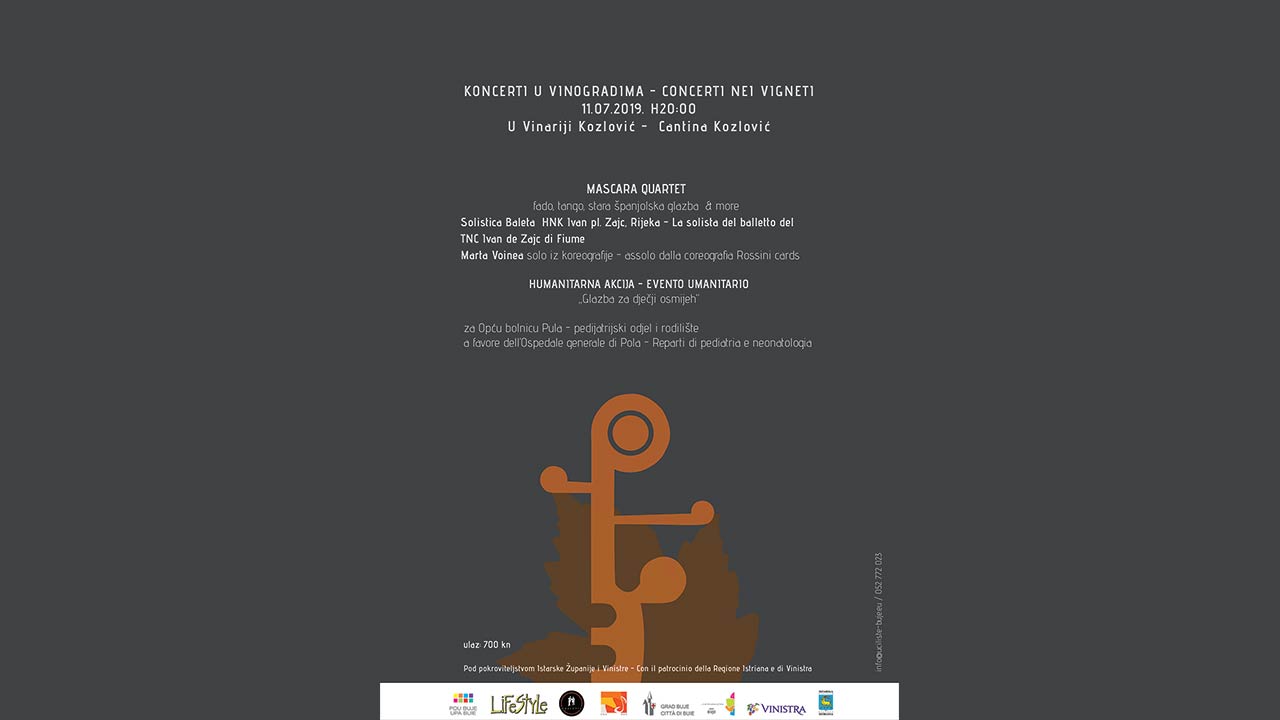 Koncert kultnog slovenskog ansambla Mascara Quartet, nastup solistice Baleta HNK Ivana pl. Zajca iz Rijeke Marte Voinea te eno-gastronomska ponuda Vinarije Kozlović i renomiranih chefova podržali su humanitarnu akciju Glazba za dječji osmijeh za nabavu dječjeg kreveta za pojačanu njegu i EKG uređaja za rodilište i pedijatriju pulske Opće bolnice.